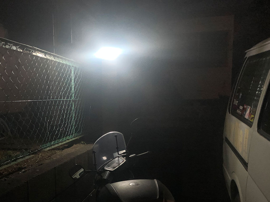 さて、夜中になって、駐車場に行ってみると、ほほう、ちゃんと光る。それなりに明るい。自分がいる限り光り続けている。無いよりは全然いい。2500円程度でこれなら、十分使えるというもんだ。あとは、耐久性がどれだけあるか。一応は防水仕様という事らしい。