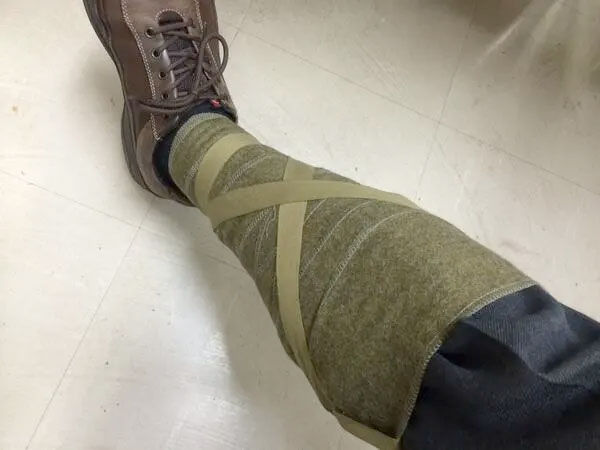 それ以上に心配に感じたのは、要は靴下をちゃんと履かないで指のところでクシャらせているのだから、長時間歩いたら、そこが擦れて靴擦れになってしまうのではないか、という事だ。実際、昔の兵隊さんの本にも、靴下がずれて靴擦れになる話はいっぱい出てくる(それは旧軍の軍足が立体裁断でなく、踵の無い寸胴タイプだった事にも原因する)。しかし、実際に歩いてみると、素足で履いた方が親指の又が痛い事が分かってきた。かつダイレクトに風が当たるので寒かったりもする。無理してでも軍足履いた方が、足が守られてる感があって安心である。