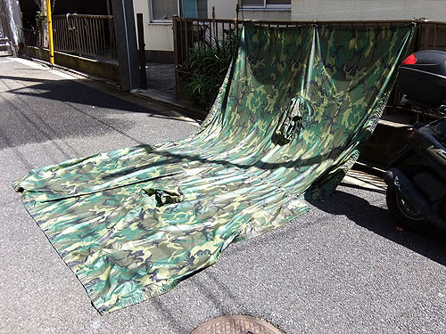 実はこのポンチョ、実はほとんど使った記憶がない。それもそのはず、サバゲーは雨降った時にはやらないから、ポンチョ被って戦闘するなんて事はなかったのだ。あとはキャンプの時に前室を作るのに使った程度である。本当に雨具として使ったのは、ASCS98で突然雨に降られた時に、装備を背負った上から被って使った、その時限りである。